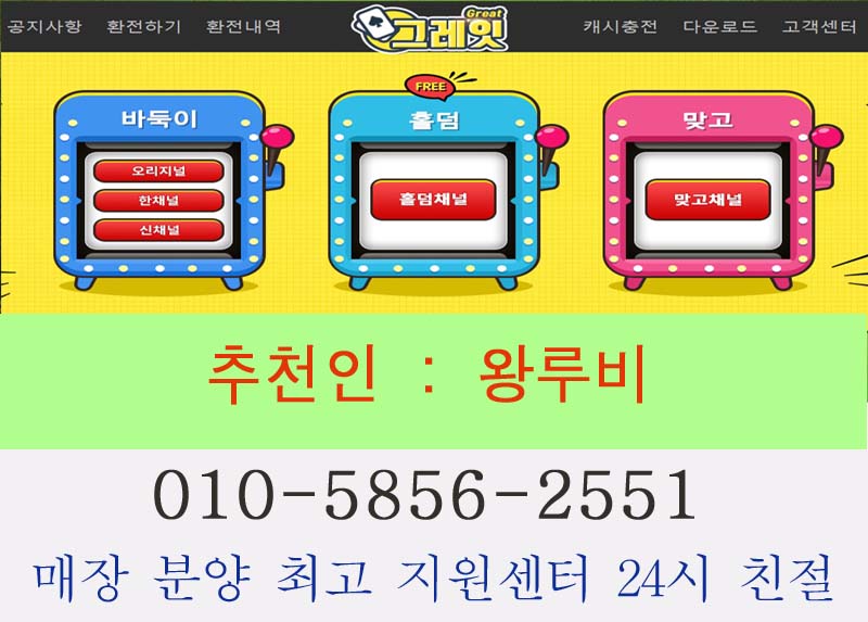 | 그레잇게임 0 1 0 ,5 8 5 6 2 5 5 1 클로버바둑이 클로버게임 제대로 그레잇게임 즐기기 (모바일지원가능) 클로버게임 | qaqad | 2020-08-24 | 조회:1327 | |